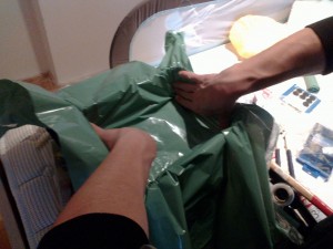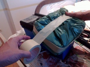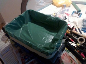 Potem sem vzel močno plastično vrečko za smeti in jo ovil okoli plastične posode.