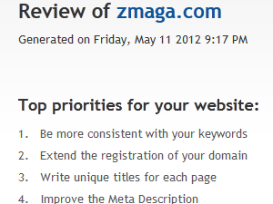 Takoj na vrhu tako najdete prioritetne zadeve, za katere spletna storitev WooRank meni, da bi jih moral lastnik spletne strani najprej narediti. |