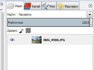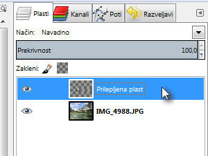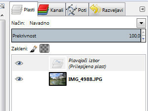 V paleti plasti bi morali videti plast z fotografijo in plavajoči izbor oziroma prilepljeno plast, ki nekako služi kot začasna plast ali layer po angleško.