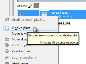 Kliknite na plavajoči izbor z desnim miškinim gumbom in izberite V novo plast.