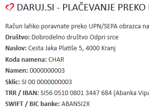 Odpre se nam stran, kjer najdete podatke o tekočem računu, na katerega lahko nakažete vašo donacijo.