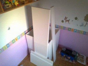 Te lesene palice smo potem pričvrstili na zgornji del postelje, vendar ne čisto na vrh, ampak okoli 7 centimetrov nižje (glej sliko).