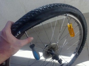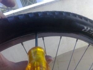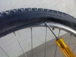 Na eni strani previdno z izvijačem odpremo plašč od kolesa in nato z drugim izvijačem nadaljujemo delo. |