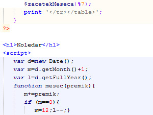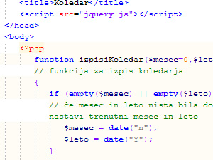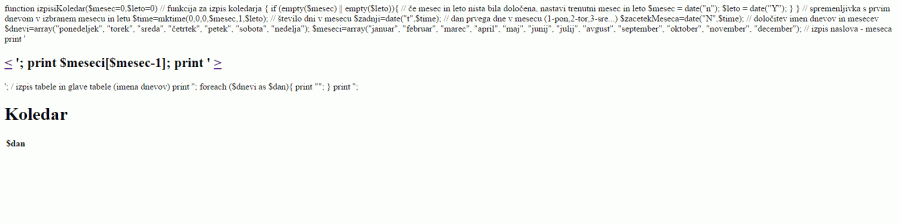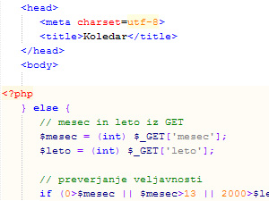 Funkcija ima dva izbirna argumenta (mesec, leto), ki določata, "kateri" koledar moramo izpisati. Če teh argumentov ne določimo, je njuna vrednost 0 (v tem primeru se določi trenutni mesec in leto). Kodo postavimo za element body. function izpisiKoledar($mesec=0,$leto=0) // funkcija za izpis koledarja { if (empty($mesec) || empty($leto)){ // če mesec in leto nista bila določena, nastavi trenutni mesec in leto $mesec = date("n"); $leto = date("Y"); } } V urejevalniku kode imam zaradi preglednosti vklopljen prelom vrstice, zato se daljša vrstica samodejno prestavi v novo! |