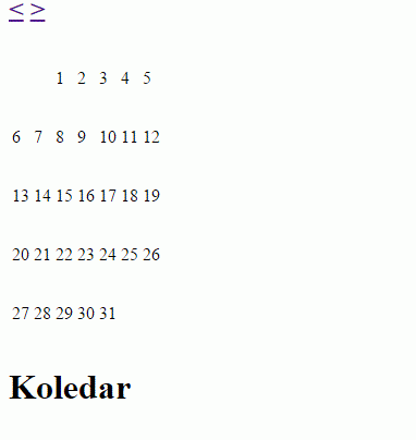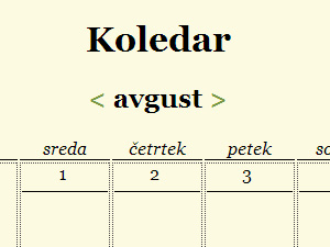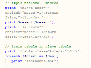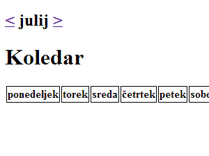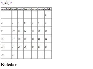 // izpis naslova - meseca print '<h2><a href="" onclick="mesec(-1);return false;"><</a> '; print $meseci[$mesec-1]; print ' <a href="" onclick="mesec(1);return false;">></a></h2>'; Ob imenu meseca se izpišeta tudi dve puščici (< >), ki ju bomo uporabili za premikanje nazaj in naprej. Več kasneje. Na vrsti je tabela s koledarjem; najprej izpišemo začetek tabele in naslovno vrstico z dnevi. Zanka foreach se bo sprehodila skozi prej nastavljeno polje imen in vsako ime dneva izpisala. // izpis tabele in glave tabele (imena dnevov) print '<table class="koledar"><tr>'; foreach ($dnevi as $dan){ print "<th>$dan</th>"; } print '</tr>'; |