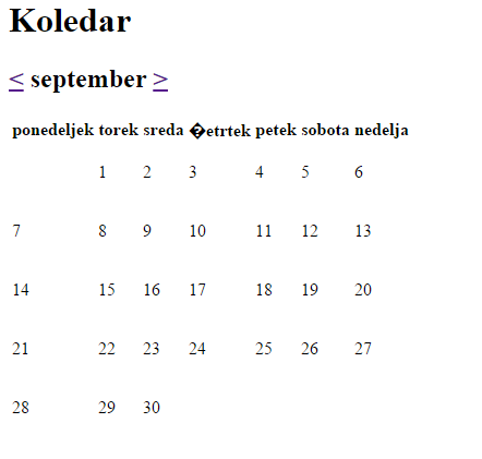 <h1>Koledar</h1> <div id="koledar"> </div> </body> </html> |
