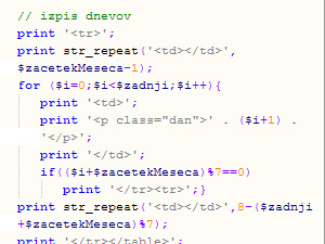 // izpis dnevov print '<tr>'; print str_repeat('<td></td>',$zacetekMeseca-1); for ($i=0;$i<$zadnji;$i++){ print '<td>'; print '<p class="dan">' . ($i+1) . '</p>'; print '</td>'; if(($i+$zacetekMeseca)%7==0) print '</tr><tr>';} print str_repeat('<td></td>',7-($zadnji+$zacetekMeseca-1)%7); print '</tr></table>'; S funkcijo str_repeat najprej izpišemo prazne kvadratke na začetku meseca (če je prvi dan meseca sreda, potem potrebujemo dva prazna kvadratka pred tem). Zanka for se izvede tolikokrat, kolikor je dnevov v mesecu, vsakič izpiše zaporedno številko dneva.