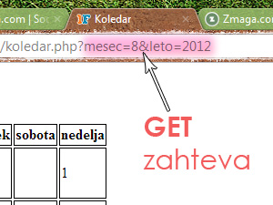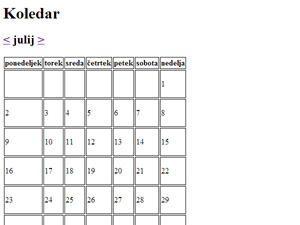 } else { // mesec in leto iz GET $mesec = (int) $_GET['mesec']; $leto = (int) $_GET['leto']; // preverjanje veljavnosti if (0>$mesec || $mesec>13 || 2000>$leto || $leto>2050) exit("Napaka v poizvedbi!"); // izpis koledarja in konec izvajanja skripte izpisiKoledar($mesec,$leto); exit; } S tem smo naredili sledeče: če GET zahteva ni bila poslana, izpiši HTML glavo in preostanek HTMLja. Če je GET zahteva bila poslana, uporabi podatke, izpiši koledar in končaj z izvajanjem.