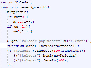 Še kratka razlaga dodane kode: ko kliknete na puščico za premik koledarja, se pokliče JavaScript funkcija mesec, ki s pomočjo AJAXa pridobi nov koledar. Brez uporabe knjižice jQuery bi za AJAX namesto ene vrstice morali napisati veliko več. |