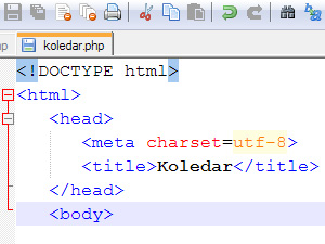<!DOCTYPE html> <html> <head> <meta charset=utf-8> <title>Koledar</title> </head> <body> Morda ste bili do sedaj navajeni veliko bolj zapletenega začetka dokumenta (npr. <!DOCTYPE html PUBLIC "-//W3C//DTD XHTML 1.0 Strict//EN" "http://www.w3.org/TR/xhtml1/DTD/xhtml1-strict.dtd"> <html xmlns="http://www.w3.org/1999/xhtml" xml:lang="en" lang="en">) Takšen zapis je bil nujen v starejših verzijah HTML (XHTML), v novem HTML 5 pa je veliko stvari poenostavljenih, enobesedni atributi ne potrebujejo narekovajev, nekaterih značk ni treba zaključiti ...