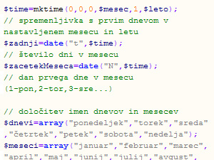 // spremenljivka s prvim dnevom v izbranem mesecu in letu $time=mktime(0,0,0,$mesec,1,$leto); // število dni v mesecu $zadnji=date("t",$time); // dan prvega dne v mesecu (1-pon,2-tor,3-sre...) $zacetekMeseca=date("N",$time); // določitev imen dnevov in mesecev $dnevi=array("ponedeljek", "torek", "sreda", "četrtek", "petek", "sobota", "nedelja"); $meseci=array("januar", "februar", "marec", "april", "maj", "junij", "julij", "avgust", "september", "oktober", "november", "december"); Funkcija mktime nam iz podanih argumentov ustvari zapis datuma in časa. Sprejema argumente: ure, minute, sekunde, mesec, dan, leto). Ker nas čas ne zanima, določimo vrednosti nič, hkrati pa kot argument dan podamo vrednost 1, kar pomeni, da bomo v spremenljivko $time shranili prvi dan tega meseca. Funkcija date nam nek shranjen datum pretvori v poljubno obliko. V prvi argument zapišemo format, ki ga želimo. Če bi želeli datum v obliki dan. mesec. leto, bi kot format napisali "j. n. Y". Več o funkciji in samih formatih najdete tukaj. Ker mi potrebujemo število dni v prej določenem mesecu, smo v format zapisali "t". V naslednji vrstici smo kot format uporabili "N", kar nam bo vrnilo zaporedno številko prvega dne v mesecu. Za konec določimo še slovenska imena dnevov in mesecev, ki jih bomo kasneje potrebovali pri izpisu. |