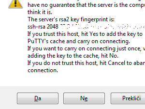 Ker gre za prvo povezavo v strežnik, nam Putty poda varnostno opozorilo, da se povezujemo v strežnik z novimi ključi.
