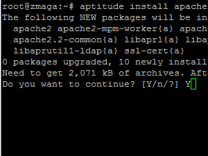 aptitude install apache2 Naložili bomo apache2. Njegovo namestitev potrdimo s tipko Y. |