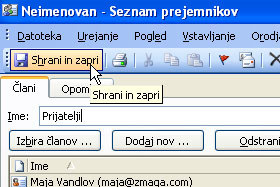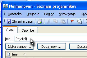 V polje Ime vpišite poljubno ime seznama. Jaz sem vpisal Prijatelji. Kliknite na gumb Dodaj nov ..., če želite dodati stik, ki ga nimate shranjenega v Outlook-u. |