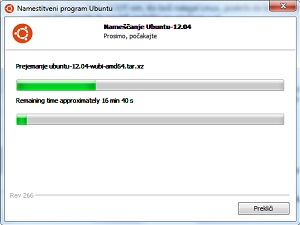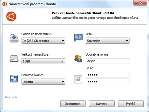 V prvem polju izberemo mesto namestitve. V drugem polju izberemo velikost diska, ki ga bo uporabljal Ubuntu. V tretjem izberemo okolje. V četrtem jezik. Nato pa še uporabniško ime in geslo. Kliknemo gumb Namesti. |