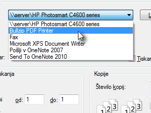 |  Kasneje, ko želimo natisniti dokument v PDF formatu, izberemo tiskalnik Bullzip PDF Printer. | |||||