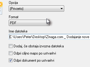|  Odprlo se bo novo okno, v katerm lahko nastavimo pot kamor naj se datoteka shrani, lahko pa nastavljamo tudi druge funkcije kot so zaščita dokumenta z geslom in dodajanje vodnega tiska. | |||||