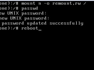 mount -n -o remount,rw / nato: passwd ter vnesemo novo geslo za root uporabnika. Nato vnesite reboot, za ponovni zagon sistema. |