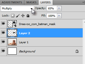 ![]() Nastavite sedaj layerju Opacity na okoli 65% in izberite senčenje na Multiply (glej sliko). |