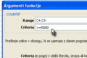 Excel mi je izračunal število celic z večjim ali enakim številom 5000.