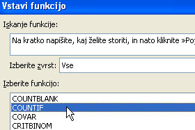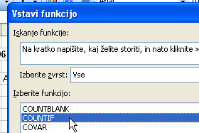 Odpre se okno za vstavljanje funckije. V polju Izberite zvrst določite Vse. V polju Izberite funkcijo pa izberite COUNTIF in kliknite na gumb V redu. |
