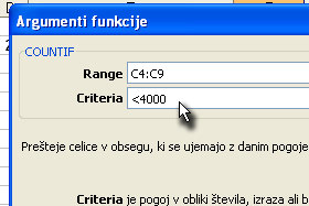 Excel je izračunal število celic, kjer se nahaja manj od števila 4000.