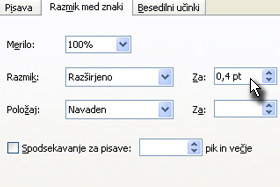 V polju Razmik nastavite Razširjeno in nato v polju Za: določite 0,4 pt.