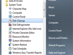 Spet kliknite Start in nato Vsi programi -> Pripomočki -> Sistemska orodja -> Čiščenje diska.