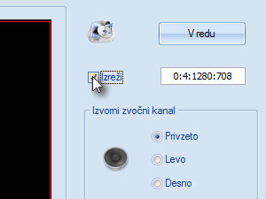 ![]() V mojem primeri imam za en milimeter črnega roba, zato sem v istem oknu označil Izreži in nato z miško na levem oknu z predogledom filma označil del, ki ga želim pretvoriti. V mojem primeru sem označil skoraj vse, razen zgornjega roba, kjer je črn del. Kliknite na gumb V redu.
