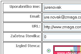 Vpišite poljubno uporabniško ime, svoj e-poštni naslov (email) in spletni naslov vaše strani. Začetna številka naj ostane 0. |