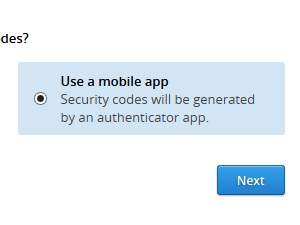 Če uporabljate Android si namestite Google Authenticator. Če uporabljate Windows Phone si namestite Authenticator. Če uporabljate BlackBerry ali iPhone si oglejte http://goo.gl/MVJ2K. Nato kliknite Next. |