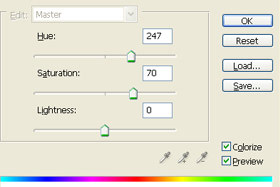 Označite Colorize. Hue nastavite 247, Saturation 70 in Lightness 0. Seveda lahko barve nastavljate poljubno. Kliknite na gumb OK. |