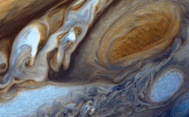 | Leta 1977 se je začela zlata dobra raziskovanja našega solarnega sistema, saj je bila 5. septembra izstreljena vesoljska sonda Voyager 1, malo pred njo pa je bila uspešno izstreljena identična sonda Voyager 2. Vesoljska plovila sta namreč prvič posredovala podrobne fotografije planetov v zunanjem delu solarnega sistema, kjer smo videli veličastne Saturnove obroče, neverjetne atmosferske spremembe na Jupitru in vulkanske aktivnosti na lunah. Na spodnji sliki lahko vidite rdečo liso na plinastem in največjem planetu v našem osončju, Jupitru, katera je posledica stoletnih neviht in je dovolj velika za tri Zemlje. Rdeča lista, ki je bila fotografirana leta 1979, je tudi razločno vidna z uporabo domačih teleskopov.