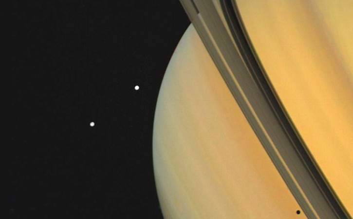 | Drugače pa sta sondi Voyager manjša izvedenka predlaganega velikega planetarnega potovanja, ki bi izkoristil redko planetarno formacijo, ki je omogočala obisk vseh zunanjih plinastih planetov vključujoč Pluton z najmanjšo porabo energije. V predlaganem načrtu so bile planirane štiri sonde, vendar pa jih je takratna administracija Richarda Nixona zavrnila in ambiciozen projekt je bil ukinjen oziroma prilagojen. Na spodnji sliki lahko vidite Saturnove obroče in njegove majhne lune, ki so v večini sestavljene iz zmrznjene vode oziroma ledu. Saturnova največja luna, Titan, je vidna na sliki spodaj desno in je pokrita z debelimi oblaki iz metana in etana.