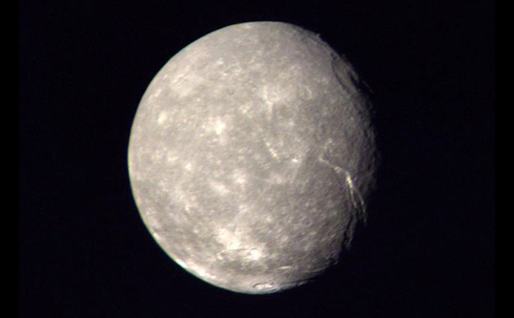 | Čeprav je sonda Voyager 2 začela pot slabo leto prej kot njena sestra, je bilo potovanje daljše in zanimivo. Na spodnji fotografiji lahko vidite največjo luno Titanija, ki kroži okoli tretjega največjega planeta v našem osončju, Urana. Slabih 1.600 kilometrov široka luna je polna kraterjev in kanjonov.