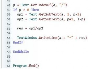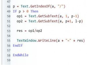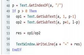 p = Text.GetIndexOf(a, "/") If p > 0 Then op1 = Text.GetSubText(a, 1, p-1) op2 = Text.GetSubText(a, p+1, l-p) res = op1/op2 TextWindow.WriteLine(a + "=" + res) EndIf |
