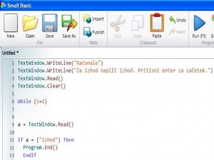 TextWindow.WriteLine("Računalo") TextWindow.WriteLine("Za izhod napiši izhod. Pritisni enter za začetek.") TextWindow.Read() TextWindow.Clear() While (1=1) a = TextWindow.Read() If a = ("izhod") Then Program.End() EndIf Program bo čakal na pritisk tipke "enter" in pobrisal zaslon. Naslednja vrstica kode pomeni, naj se program ponavlja v neskončnost (dokler je 1 enako 1) in kasneje, če piše izhod, se program zapre. |