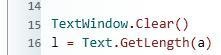 TextWindow.Clear() l = Text.GetLength(a) 1. vrstica kot prej pobriše zaslon, 2. pa ugotovi dolžino vnosa.
