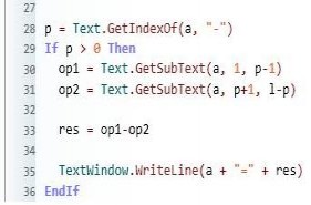 p = Text.GetIndexOf(a, "-") If p > 0 Then op1 = Text.GetSubText(a, 1, p-1) op2 = Text.GetSubText(a, p+1, l-p) res = op1-op2 TextWindow.WriteLine(a + "=" + res) EndIf |