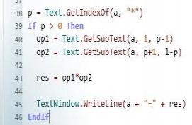p = Text.GetIndexOf(a, "*") If p > 0 Then op1 = Text.GetSubText(a, 1, p-1) op2 = Text.GetSubText(a, p+1, l-p) res = op1*op2 TextWindow.WriteLine(a + "=" + res) EndIf |