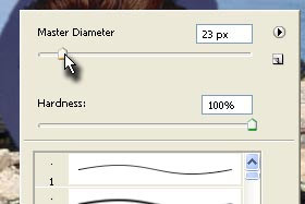 Jaz sem določil Master Diameter: 23 px in Hardness 100% ker obdelujem srednje veliko fotografijo. Pritisnite tipko ESC, da zaprete okno. |