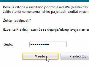 Ko želite dostopati do zaščitenega območja v programu avast! Antivirus, se prikaže pojavno okno, ki zahteva vnos nastavljenega gesla. Vnesite geslo in kliknite na gumb V redu. V nasprotnem primeru dostop do tega dela programa ni mogoč.