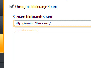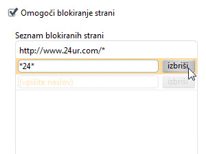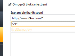 ![]() Omogočeno je tudi bolj splošno blokiranje večih spletnih strani s tem, da namesto točno določenega URL naslova spletne strani, na seznam blokiranih dodate ključno besedo, ki jo zapišete med zvezdici (*primer*). V primeru na sliki bodo blokirane vse spletne strani, ki v naslovu vsebujejo niz 24 (npr. http://24ur.com/ in prav tako tudi http://zurnal24.si/ ter druge z nizom 24 v spletnem naslovu).