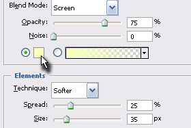 Blend Mode določite Screen, Opacity 75 % in Noise 0 %. Technique določite Softer, Spread 25 % in Size 35 px. Kliknite na kvadratek za določanje barve. |