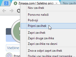 Kliknite na zavihek z desno miškino tipko in kliknite na Pripni zavihek. Pripete zavihke prepoznate po tem, da so skrčeni in prikazujejo le ikono spletne strani ter so povsem na levem delu vrstice z zavihki. V kontekstnem meniju so tudi možnosti za ponovno odprtje zaprtega zavihka, zapiranje zavihkov levo ali desno od trenutnega, podvojitev zavihka in dodajanje odprtih zavihkov med zaznamke.
