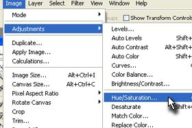 Ko boste celotno vetrobransko steklo označili, kliknite zgoraj na Image, Adjustments in izberite Hue/Saturation...