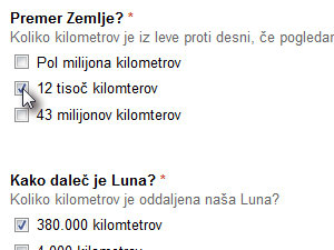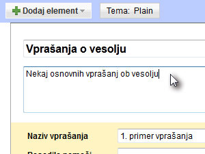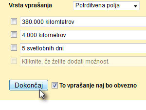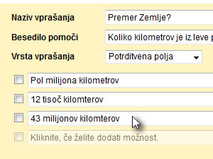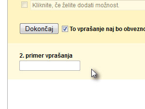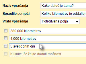 ![]() Nato pa dodate prvo vprašanje in z potrditvenimi polji dodate nekaj odgovorov. |