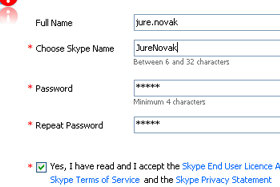 Vpišite poljubne podatke. V polje Choose Skype Name vpišite ime brez presledkov. Spodaj označite Yes, I have read and I accept the Skype End User Licence Agreement the Skype Terms of Service and the Skype Privacy Statement. Kliknite na gumb Next. |