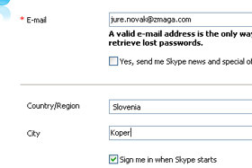 Spodaj ne označite Yes, send me Skype new and special offers. Določite državo in mesto. Označite Sign me in when the Skype starts. Kliknite na gumb Sign In. |