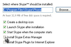 Install Skype Extras Manager naj ne bo označen (glej sliko). Ker želim uporabljati program brez dodatnih stvari, ki jih ne potrebujem, sem to odstranil. Nič pa ne bo narobe, če boste to možnost pustili označeno. Kliknite na gumb Install. |
